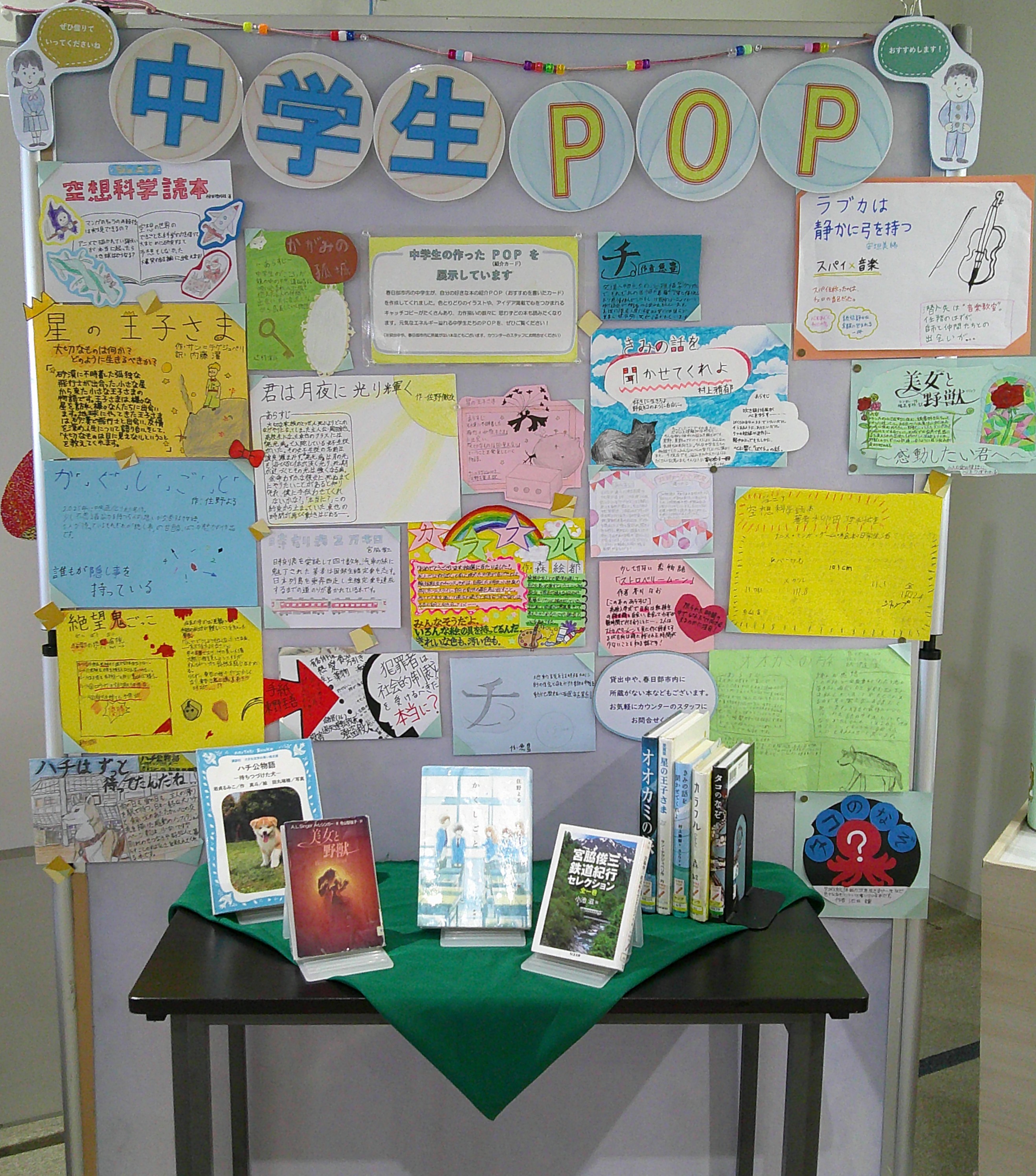 11月1日より庄和図書館1階返却カウンター横で、中学生が作ったPOPを展示しています。