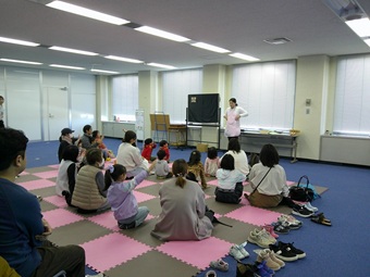 ブックリサイクルも後半になって会場も落ち着いたころ、庄和総合支所2階のフリースペースでは、いつものおはなし会とはちょっと違った「おたのしみ会」が始まりました。