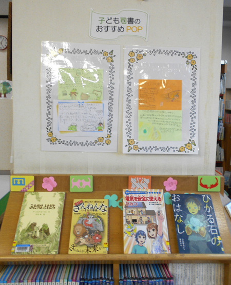 こども司書のすてきなPOPと一緒に、おすすめの本を児童開架室で展示しています。