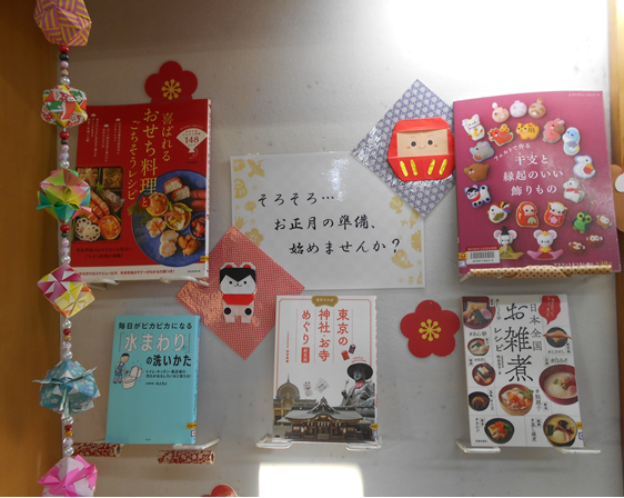 おせち料理や、年賀状の書き方、掃除の仕方、お守りの本などを展示中です!