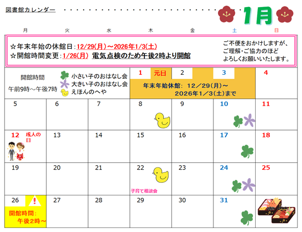 【日時】第4木曜日 えほんのへや実施前後の午前10時から12時頃まで